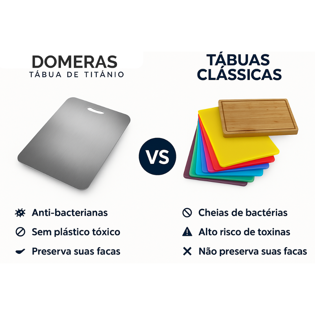 A tábua de corte DOMERAS™ TÁBUA DE TITÂNIO redefine o padrão de higiene, durabilidade e elegância na cozinha moderna.